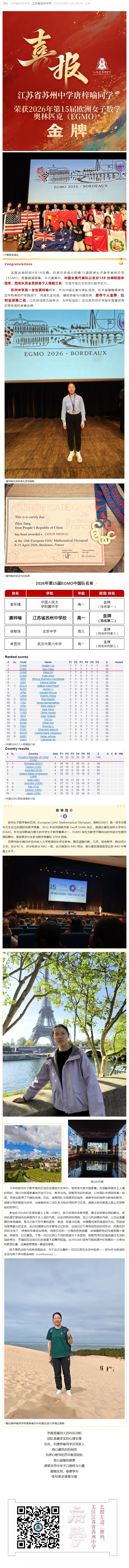 喜报!为国争光!苏州中学唐梓喻斩获欧洲女子数学奥林匹克金牌